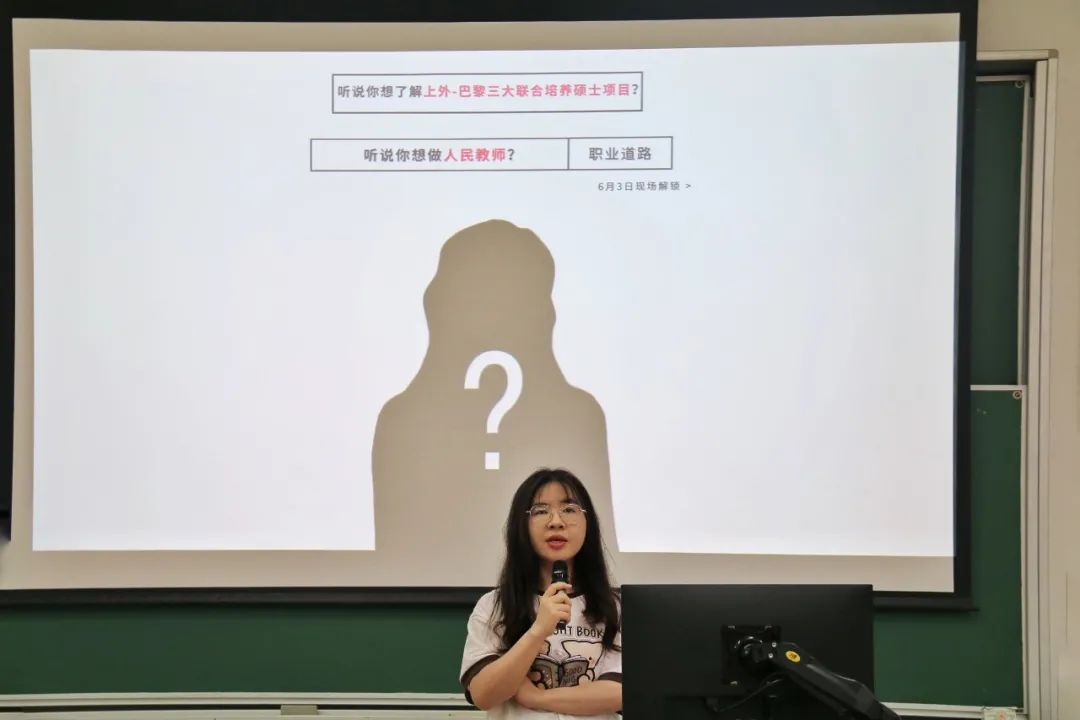 最后,邢璐学姐为我们详细介绍了上外——巴黎三大的联合硕士培养项目。就读于该项目的学生将于研究生二年级进入巴黎三大,学习FLE(Français langue étrangère)专业。该专业的课程设置十分丰富,除了与教学实践紧密相关的课程,还有语言学和文学方面的课程。到了研三,同学们可以选择留在巴黎继续攻读硕士,也可以回到上外完成学业。学姐表示联合培养项目的课业压力的确比其他项目更大,但能学到很多东西,拓宽视野。如果对教学法方向感兴趣,可以尝试报考。