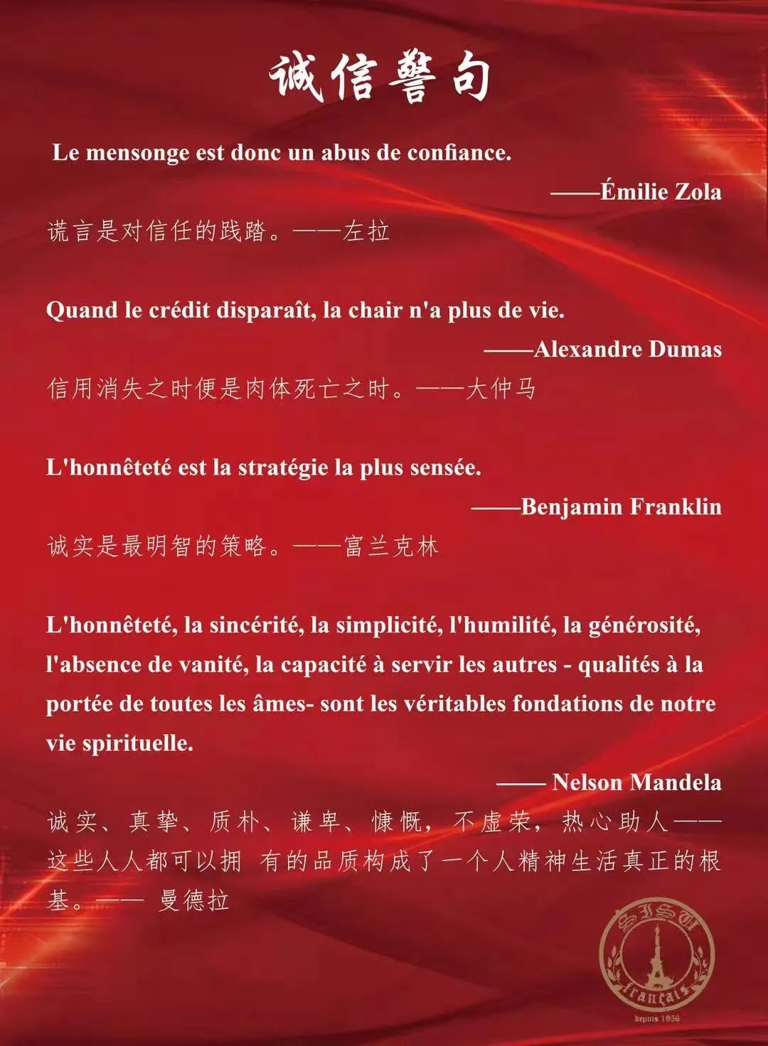 古人云:“人无信不立。”诚实守信一直是中华传统美德,也是当代社会主义核心价值观的要求之一。法语系将继续弘扬并贯彻对广大学生的诚信教育,为祖国培养一批批德才兼备的社会主义建设者和接班人。