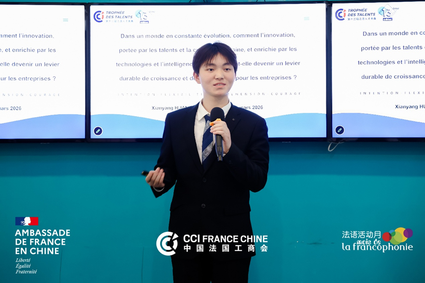 大赛以« Dans un monde en constante évolution, comment l’innovation, portée par les talents et la créativité humaine, et enrichie par les technologies et l’intelligence artificielle, peut-elle devenir un levier durable de croissance et de compétitivité pour les entreprises ? »(“在持续变革的世界中,创新以人才与人的创造力为引擎,又借助技术与人工智能不断丰富——这样的创新如何持续推动企业实现可持续增长与竞争力提升?”)为主题,采用“1分钟自我介绍+12分钟主题演讲+7分钟评委问答”的经典赛制,全方位考察选手的法语综合能力、思辨深度与跨文化视野。备赛期间,黄先洋在刘莹莹、王婉媛两位指导老师的悉心带领下,聚焦创新、人才创造力、人工智能与企业可持续增长等核心议题,反复打磨演讲逻辑与表达细节,凭借扎实的学术积淀与出色的现场发挥赢得评委一致认可。欧洲学院法语系全程提供学术支撑与后勤保障,为选手冲刺夺冠保驾护航。